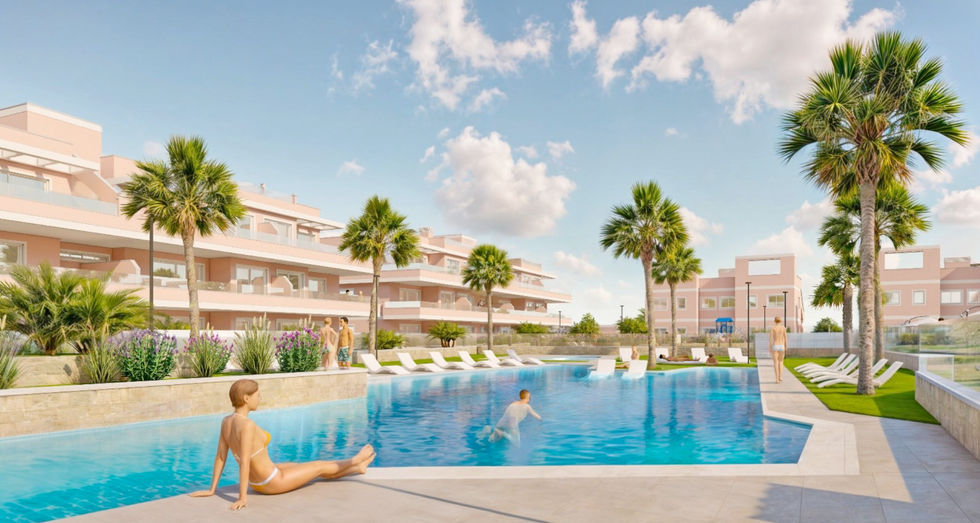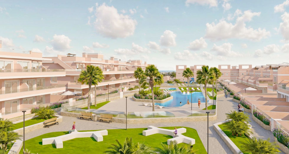 "Vista Azul XXXVIII Lo Monte Selection" is a new residential complex in Pilar de la Horadada, offering a choice of 3-bedroom apartments, townhouses, and bungalows. This development is ideal for familes who want to enjoy the large communal pool, large garden areas, and a safe children's play area. The upper-floor homes include a private solarium with a summer kitchen and outdoor shower, while all homes feature a fully equipped modern kitchen. Located near beautiful beaches and amenities, and even includes pre-installation for electric vehicle charging."